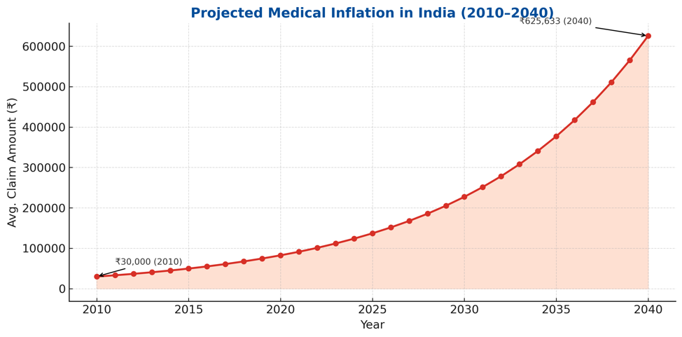 - Medical inflation in India is ~10–12% annually, meaning costs double every 7–8 years.