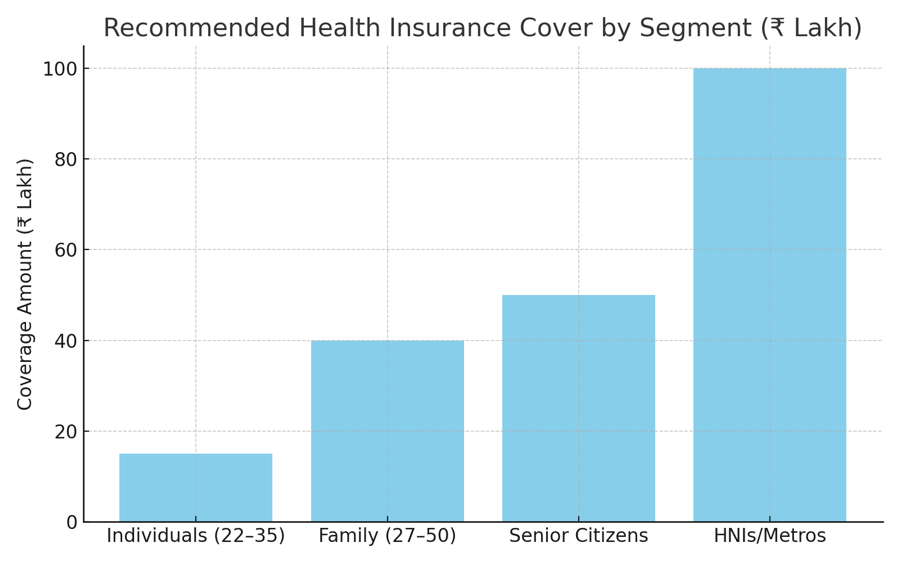 - Family of 3–4 (27–50 years): A ₹25–50 lakh floater policy is advisable, as medical costs tend to compound with multiple dependents.