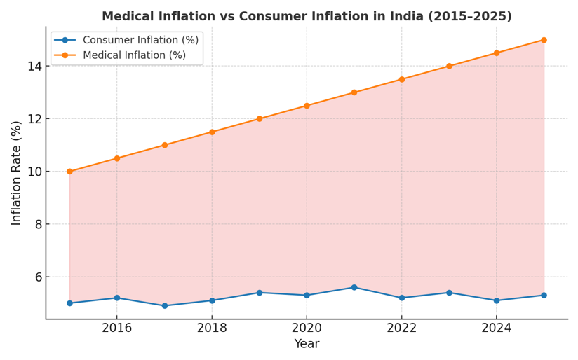 1. Medical Inflation: Healthcare inflation in India averages around 10–12% annually — double the consumer inflation rate. This means costs double every 7–8 years.